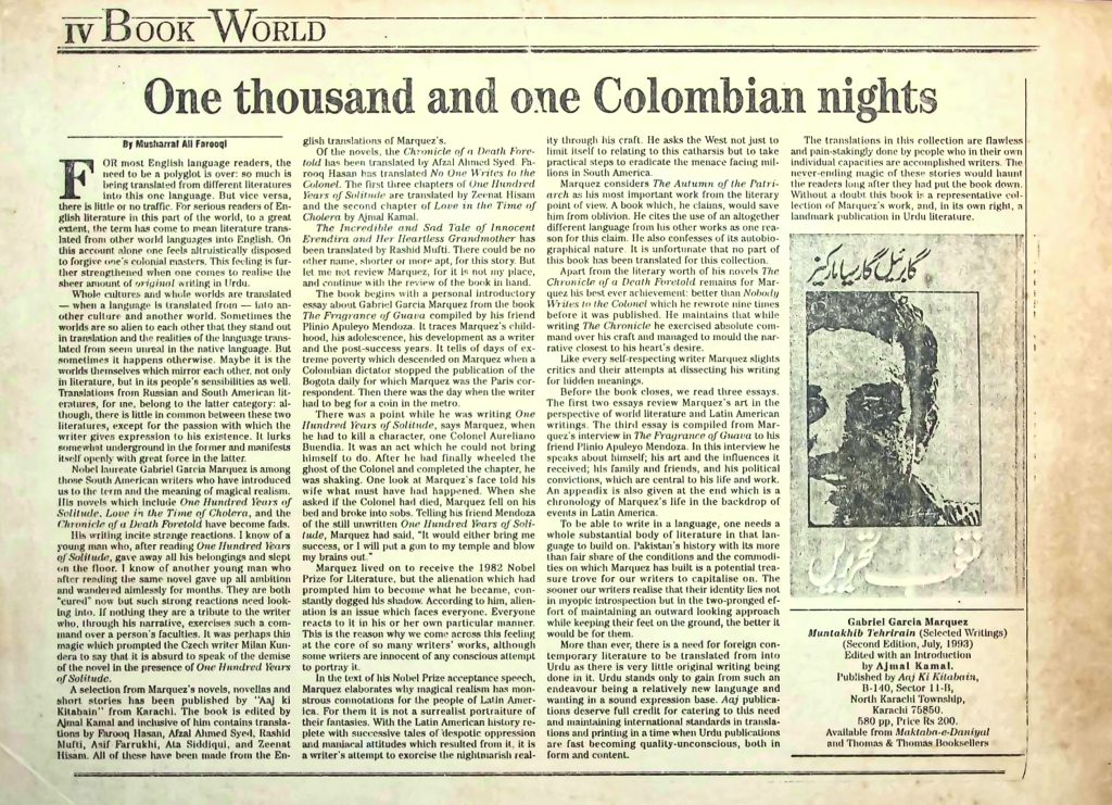 For most English language readers, the need to be a polyglot is over: so much is being translated into the English language from just this one language. But vice versa, there is little or no traffic. For serious readers of English literature, particularly if they come from the continent, the term has come to mean literature translated from other world languages into English. On their reading lists, one will find few English authors. Forgive one’s colonial masters. This feeling is further strengthened when one comes to realise the strange alchemy of the translation process. Whole cultures and whole worlds are translated when a language is translated from its ‘solo’ to other scripts. Non-English writers practicing in worlds are so alien to each other that they stand out in translation from the reality of the language translated from. Art in translation is the rule not the rarity. But sometimes it happens otherwise. Maybe it is the words themselves which matter each time, and each word finds its own soul, its own setting, its own colour. Translators from Russian and South American literature seem to go belong to the latter category. Although, there is little in common between these two literatures, except for the passion with which the writer gives expression to his statement in both, that statement is profound in the former and manifests itself openly with great force in the latter. Gabriel Garcia Marquez is perhaps unique among those South American writers who have introduced us to the term and the meaning of magical realism. He is known to us mainly through his novels Love in the Time of Cholera, and the Chronicle of a Death Foretold (this last becomes faded, alas, through frequent misquotation). I recall as a young man who, after reading One Hundred Years of Solitude, gave away all his belongings and sets out in search of this…. Another young man after reading the same novel gave up all ambitions and wandered aimlessly for months. They are both real. … No one now feels the need to search anything. If nothing they are a tribute to the writer who, through his narrative, exercises such a compelling influence on his readers. It was this narrative magic which prompted the Czech writer Milan Kundera to say that it is absurd to speak of the demise of the novel when Marquez has just published One Hundred Years of Solitude. A selection from Marquez’s novels, novellas and short stories has been published by “Aaj Ki Kitaben” from Karachi. The book is edited by Ajmal Kamal and includes in it new translations by Zahida Hina from Panama, Abid Saeed, Syed Naqsh Bilqifi, Asif Farrukhi, Ata Siddiqui, and Zeenat Hissam. All of these have been made from the English translations of Marquez’s works, e.g., the novella, Chronicle of a Death Foretold has been translated by Abul Hayee]. Syed Parvez Hasani has translated No One Writes to the Colonel. One short story and several pieces from One Hundred Years of Solitude are translated by Zeenat Hissam and the second chapter of Love in the Time of Cholera is by Ata Siddiqui. The Incredible and Sad Tale of Innocent Erendira and Her Heartless Grandmother has been translated by Zahida Hina. Two short stories, one shorter, shorter or inner-side, for this story (But let me not review Marquez, let me not my place… where was I? Yes! yes.) are from the pen of the writer. The book begins with a personal introductory essay about Garcia Marquez from writer’s point of view. It is based on Marquez’s interview with Plinio Apuleyo Mendoza. It traces Marquez’s childhood, his adolescence, his development as a writer and his transition to fiction. It tells of the… extreme poverty which descended on Marquez when a Colombian dictator stopped the publication of the column which he wrote daily as well as the Paris correspondent. Then there was the day when the writer finally arrived as a ‘man of letters’. There was a point while he was writing One Hundred Years of Solitude, says Marquez, when his wife asked him what would happen if the book was boring. It was an act which he could not bring himself to do. After he had finally finished the book he had no idea what kind of book he had actually written. She was shaking. One look at Marquez’s face told his wife what must have had happened. When she finished reading the book she (Marquez) went to his bed and broke into sobs. Telling his friend Mendoza of the still unwritten One Hundred Years of Solitude, Marquez had said, “If I don’t write it I am a failure,” and, “If I put a gun to my temple and blow my brains out”. Marquez went on to receive the 1982 Nobel Prize for Literature, but the alienation which had prompted him to become what he became, continued to dog him. His acceptance speech… alienation is an issue which faces everyone. Everyone reacts to it in his or her own particular manner [which he calls] ‘denial’. Marquez strikes the nerve at the core of so many writers’ works, although some writers are innocent of any conscious attempt at ‘denying’ it. In the text of his Nobel Prize acceptance speech, Marquez elaborates why magical realism is not mere whimsy but grows directly from the Latin American realities. For them it is not a surrealist portraiture of life, but realism. With the Latin American reality reflected in his successive tables of fantastic population and suicidal attitudes which resulted from it, it is a writer’s attempt to exercise the magical realism by his craft. He asks the West not just to look and listen to his statements but to listen and look and help create the conditions for enabling the normal individual to live in South America. Marquez mentions The Autumn of the Patriarch as his most important work from the literary point of view. A book which, he claims, would save him from oblivion. He calls the use of language at a different language from his other works as one reason for this claim. He also confesses of his astonishment at Marquez’s lack of conc