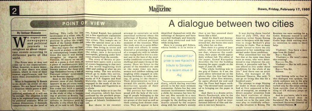 We expect our newspapers and political journals to enlighten us about important events occurring in different parts of the world. The Press may or may not come up to our expectations. What, however, is more important is that there are some events, which in view of their human significance, ask for more than journalistic treatment. What is happening in Bosnia is no doubt an event of this nature. We are faced here with a situation which poses a challenge to our moral sense. Mere political analysis of it will not be enough. The situation is too big to be explained away purely by political analysis. With its human dimensions, it demands comprehension on the level of feeling. This calls for the involvement of a writer. Such a commitment, may be in a better position to grasp the tragic aspect of the human drama and express it graphically. One may regret that our literary world at present is not alive to contemporary human situations the way it was during struggles in Algeria and Vietnam. Of course we are off and on a poem, a short story or a piece of impressionistic writing about Bosnia published in a literary journal. But there seems to be no anxiety betraying a lack of Pakistani writers’ involvement in the Bosnian tragedy. Seen in this background, the present issue of Aaj, Karachi, appears to me an event worth noticing. This literary journal has come out with a special issue of sizable volume devoted to the study of what is happening at present in Bosnia. The issue has been presented as a tribute to Sarajevo paid by Karachi, a city which has a tale of its own to tell. The editor, Ajmal Kamal, has pointed at a few significant similarities between the sufferings of the two cities. This tempts me to take the special issue as a dialogue between two unfortunate cities. One living in terror and violence emerging from within the other, now a devastated metropolis, groaning under ferocious attacks from the outside. The story of Bosnia as presented here opens with a survey of the happenings in that part of the world beginning with 1500 and ending at what we are seeing today. The two articles, which go to make this survey, are in fact extracts from the works of V.P. Gangan and Noel Malcolm, the two authorities engaged in the study of the history of Bosnia and Yugoslavia as a whole. The survey helps us to see the real situation, which has been confused by the pre-hash propaganda machinery harping on the slogan of Islamic fundamentalism. But there is no counter attempt to entertain us with emotional accounts about the sufferings of Bosnian Muslims. Nor are we offered political analyses of the situation. What this study aims at is quite different from such efforts. It seems directed at presenting a portrait of a ravaged city with its inhabitants trying hard to live in a normal way in the face of the intolerable conditions created by the shellings and sniper firing of the enemy. Here we listen to the groans of the wounded city and at the same time see men, women and children talking and angling, while engaged in collecting fire-wood in a ruin, making, in groups, to the theatre. Their determination to live a normal life amidst death and destruction speaks of their courage and fortitude. The portrayals here concern people belonging to the different nationalities and ethnic groups of this land as well as those coming from distant countries. They all appear to have identified themselves with the sufferings of Sarajevo and have recorded feelingly and honestly what they observed and felt while living here. ‘Here is a young girl, Zlata, whose hobby it is to write a diary, which during wartime proves to be her most intimate companion. Zlata has her own innocent involvements betraying her zest for instance her love for her cat. She records in a very normal way the destructions wrought by the shelling and the deaths caused by the snipery along with her mother’s anxiety that a rat has entered their home like a thief. Amidst the death and destruction going on intermittently around her, she bursts into tears only when her cat dies. Then there is a group of journalists, who are determined to see that, whatever the conditions, their paper should appear daily without fail. The editor of the paper, Kemal Kurspahic describes the fire: the building housing the paper caught fire ‘the night of June 27, 1992’. “The whole building was in the grip of flames. At six, the news editor informed me on the phone that the fire had been quenched. After five minutes, he again phoned me and said that the Press had been saved. The devoted team succeeded in bringing out the paper on time.” And there is a drama artist, Haris Paschovitch, who in the very thick of shelling by Serbs managed to hold an international festival of folk and theater in war-torn Sarajevo. It was during these fateful days of July 1993, that the American writer Susan Sontag went to Sarajevo with the intention to stage Beckett’s play Waiting for Godot. That so many people wanted to leave the city appeared to her something very normal under those conditions. What astonished her was the fact that at the same time there were so many, who were determined to stay, “to save the city”. Ms. Sontag felt, “how can I afford to live under these conditions for the whole of my life?”. And there was no artist there. At the National Theatre, the manager of the theatre, “She said, ‘I can get you living. She did for a hundred years.'” The attempt to stage Waiting for Godot is thus crucial these days had appeared to be a stage for surrealist absurdities, an attempt to divert peoples’ attention from the hard realities of those times. But when presented, it turned out to be the most relevant play in its ability to reflect the situation in Bosnia. The Bosnians too were waiting for a Godot. Someone wanted to cut the play Waiting for Clinton.’ But Godot kept them waiting with no intention to come to their help. Vladimir: You have a message from Mr. Godot? Boy: 