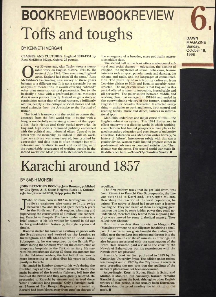 Brunton started his career as a railway engineer with the Stephensons and worked on the London to Birmingham and tife Manchester to Leeds lines. Subsequently, he was employed by the British War Office during the Crimean War, for the construction of temporary hospitals on the Turkish territory. He nar-rates his experiences during all these assignments but for the Pakistani readers, the last half of his book is more interesting as it describes his years in India, mostly in Karachi.