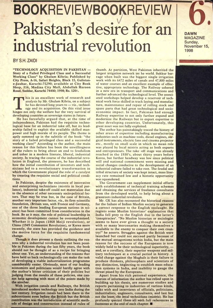 “TECHNOLOGY ACQUISITION IN PAKISTAN Story of a Failed Privileged Class and a Successful Working Class” by Ghulam Kibria; Published by City Press, A-16, Safari Heights, Block 15, Gulistan e-Jauhar, Karachi-75290; available at City Book Shop, 316, Madina City Mall, Abdullah Haroon Road, Saddar, Karachi 74400; 1998; Rs. 120/-