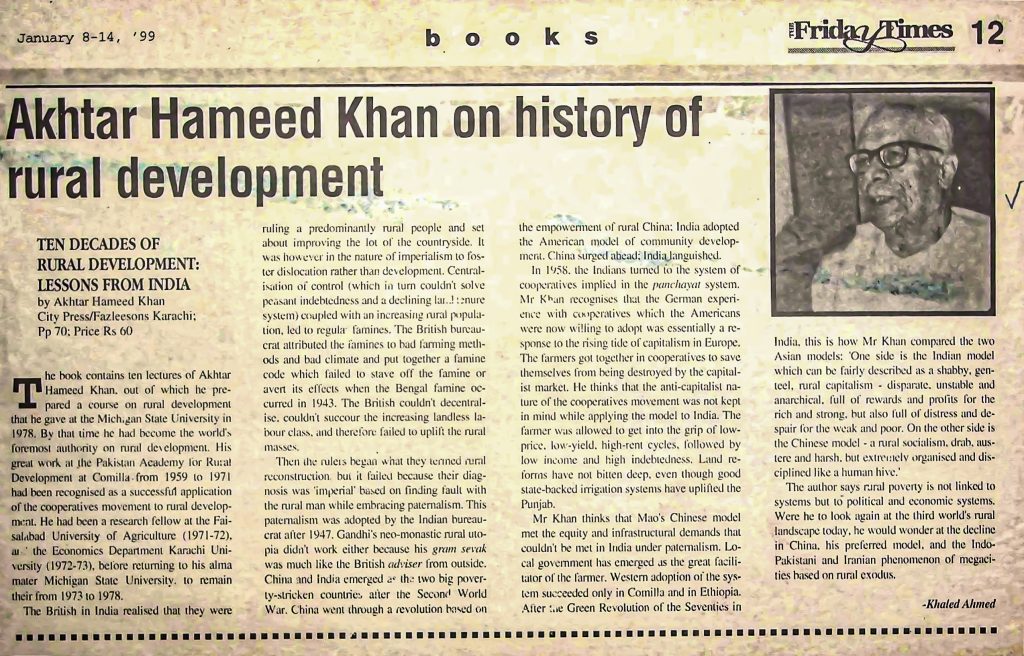 T he book contains ten lectures of Akhtar Hameed Khan, out of which he pre-pared a course on rural development that he gave at the Michigan State University in 1978. By that time he had become the world’s foremost authority on rural development. His great work at the Pakistan Academy for Rural Development at Comilla from 1959 to 1971 had been recognised as a successful application of the cooperatives movement to rural develop-ment. He had been a research fellow at the Fai-salabad University of Agriculture (1971-72), a the Economics Department Karachi Uni-versity (1972-73), before returning to his alma mater Michigan State University, to remain their from 1973 to 1978.