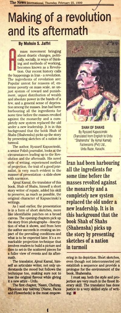 Ajmal Kamal, the translator of this book, Shah of Shahs, himself a short story writer of repute, added his skill to preserve, as much as possible, the original character of Kapuscinski’s writings.