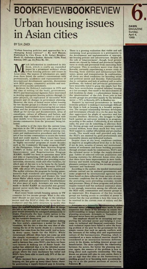 “Urban housing policies and approaches in a changing Asian context’ Arif Hasan; Published by City Press, A-16, Safari Heights, Block 15, Gulistan-e-Jauhar, Karachi 75290; First Edition, 1997, pp. 61, Price Rs. 50/