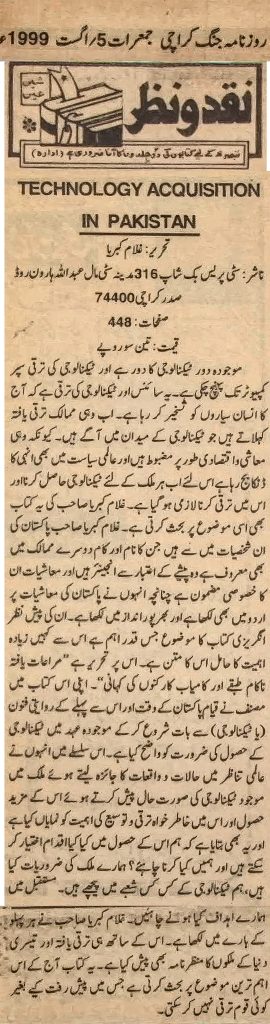 TECHNOLOGY ACQUISITION IN PAKISTAN تحریر: غلام حیدر پبلشر: سٹی پر لمیٹڈ، بک شاپ ۳۱۶، سٹی ہال، عبداللہ ہارون روڈ، صدر، کراچی ۷۴۴۰۰ صفحہ: ۴۴۸ قیمت: تین سو روپے موجودہ دور ٹیکنالوجی کا دور ہے اور ٹیکنالوجی کی ترقی ہر ایک مُلک کی ترقی کے لیے سمارٹ اور ٹیکنالوجی کی تیزی کے اسباب انسانوں کو کشمیر کا امیر ہے اب وہ مالک سمالک ترقی یافتہ کھلاتے ہیں جو ٹیکنالوجی کے میدان میں آگے ہیں۔ کیونکہ وہ سمالک مضبوط اور کاغذی ریاست میں بھی ان کا دُشکاڑ رہا ہے اس لئے اب ہر مُلک کے لئے ٹیکنالوجی حاصل کرنا اور اس میں ترقی کرنا لازمی ہو گیا ہے۔ غلام حیدر صاحب کی یہ کتاب بھی اسی موضوع پر بحث کرتی ہے۔ یہ نظام گھیرا صاحب کا پاکستان کی ان خصوصیات میں سے جن میں کام اور کام دوسرے ممالک میں بھی معروف ہے دو پچھتے کے اشارے سے اہمیت ہے اور معاشیات ان کا میں بھی مضمون ہے چنانچہ انہوں نے پاکستان کی معاشیات پر زور و تمر بھی لکھ دیا اور بہت رائے میں چھپا ہے انگریزی ترقی کا سو موضوع میں قدرت راقم کی اہم ہے اس نے نہیں زیادہ اہمیت کا حامل اس کا متن ہے اس پر تحریر ہے “عرصہ ذات اندر نظام شریعت اور کامیاب کارکنوں کی کہانی” اپنی اس کتاب میں مصنف نے قیام پاکستان کے وقت اور اس سے پہلے سے روایتی فنون (یا ٹیکنالوجی) سے بات شروع کر کے موجودہ عہد میں ٹیکنالوجی کے حصول کی ضرورت کو اُجاگر کیا ہے، اس سلسلے میں انہوں نے عالمی سطح پر ملز و واقعات کا جائزہ لیتے ہوئے مُلک میں موجودہ ٹیکنالوجی کی صورتِ حال پیش کرتے ہوئے اس کے مزید حصول اور اس میں خاطر خواہ ترقی و توثیق کی اہمیت کو نمایاں کیا ہے اور یہ بھی بتایا ہے کہ ہم اس کے حصول میں کیا کیا اقدام اختیار کر سکتے ہیں اور ہمیں کیا کرنا چاہیے؟ ہمارے مُلک کی ضروریات کیا ہیں، ہم ٹیکنالوجی کو کس نہج میں حاصل کر سکتے ہیں۔ مختصراً بہرارے اطراف پر ایک ہو جائے چاہیے، غلام حیدر صاحب کا ہر پہلو سے بات کیا ہے ان کے ساتھ گھیرا یزید رتھے اور گیرم بھی ایک ملک سے دُور پر گھیرا بھی پیش کیا ہے یہ کتاب اُن کے اس اہم موضوع پر بحث کرتی ہے جس میں ترقی یافتہ قوم کے لئے کوئی قوم ترقی نہیں کر سکتی۔