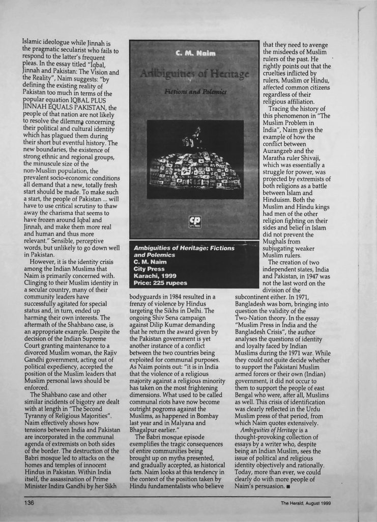 Islamic ideologue while Jinnah is the pragmatic secularist who fails to respond to the latter’s frequent pleas. In the essay titled “Iqbal, Jinnah and Pakistan: The Vision and the Reality”, Naim suggests: “by defining the existing reality of Pakistan too much in terms of the popular equation IQBAL PLUS JINNAH EQUALS PAKISTAN, the people of that nation are not likely to resolve the dilemma concerning their political and cultural identity which has plagued them during their short but eventful history. The new boundaries, the existence of strong ethnic and regional groups, the minuscule size of the non-Muslim population, the prevalent socio-economic conditions all demand that a new, totally fresh start should be made. To make such a start, the people of Pakistan… will have to use critical scrutiny to thaw away the charisma that seems to have frozen around Iqbal and Jinnah, and make them more real and human and thus more relevant.” Sensible, perceptive words, but unlikely to go down well in Pakistan.