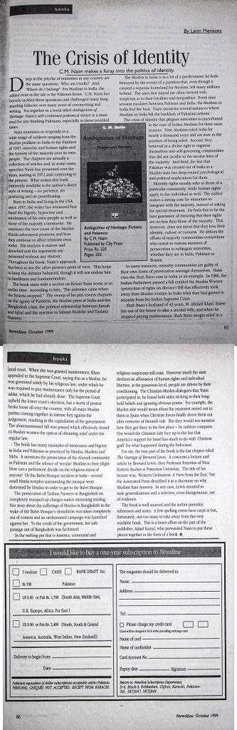 D eep in the psyche of minorities in any country are the same questions. Who am I really?” And, Where do I belong?” For Muslims in India, the added twist in the tale is the Pakistan factor. C.M. Naim has bravely tackled these questions and challenged many long-standing fallacies over many years of commenting and writing. Put together in a book titled Ambiguities of Heritage. Naim’s self-confessed polemical stance is a must-read for any thinking Pakistani, especially in these troubled times.