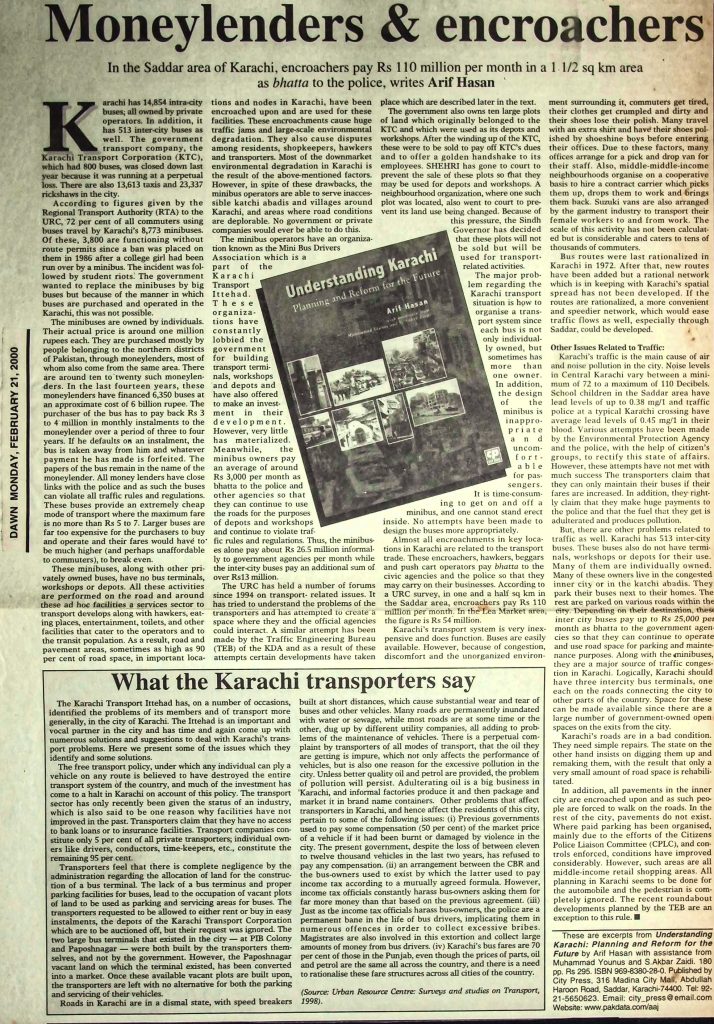 These are excerpts from Understanding Karachi: Planning and Reform for the Future by Arif Hasan with assistance from Munammad Younus and S.Akbar Zaidi. 180 pp. Rs 295. ISBN 969-8380-28-0. Published by City Press, 316 Madina City Mall Abdullah Haroon Road, Saddar, Karachi 74400 Tel: 92-21-5650623. Email: city press@email.com Website: www.pakdata.com/a