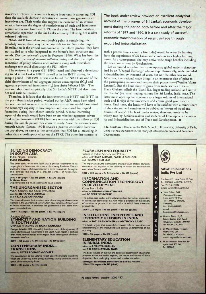 The book under review provides an excellent analytical account of the progress of Sri Lanka’s economic develop-ment during the period both before and after the major reforms of 1977 and 1990. It is a case study of successful economic transformation of recent vintage through export-led industrialization.