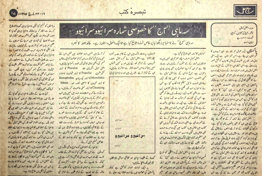 سہ ماہی “آج” نے بوسنیا ہرزیگوو نیا پر خاص شمارہ شائع کیا ہے جو ایک انمول دستاویز ہے۔ خالد احمد کا تبصرہ
