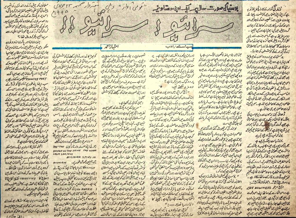 ڈھائی تین برسوں سے دنیا بوسنیا کی جنگ کا تماشا دیکھ رہی ہے اور خاموش ہے جیسے قوت گویائی سلب کر لی گئی ہو اور بول کہ لب آزاد ہیں تیرے
