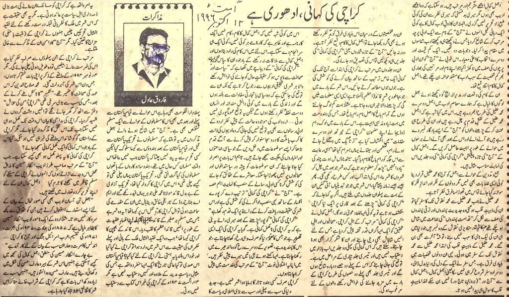 اس میں کوئی شبہ نہیں کہ اجمل کمال کا کام، کام نہیں ایک کارنامہ ہے اور ظاہر ہے کہ کارنامے ہر کوئی نہیں، کوئی ایک ہمیں سر انجام دے سکتا ہے۔ اس لئے میں اس کام کی داد دیتا ہوں اور اجمل کمال سے باقات نہ رکھنے کے باوجود ان کا سپاس گزار ہوں پراچی کی کمانی” کے دیا ہے میں لکھا ہے کہ ” سیاست اور صحافت سے مایوس ہو کر حقیقت حال کو جانے کی خواہش رکھنے والا ہر شعری تخلیقی ادیبوں سے رجوع کرتا ہے کیونکہ ان سے توقع کی جاسکتی ہے کہ وہ سیاسی یا تجارتی مفادات سے بلند ہوں کے اور زندگی کے بارے میں کوئی دانش مندانہ اور انسان اور میں کو درست نقطہ نظر رکھتے ہوں گے لیکن یہ توقع عموماً پوری سیر کے لیکن یہ توقع عموماً پوری نہیں ہوتی۔ اردو ادب کی موجودہ حالت کے پیش نظر اردو کے ادبی رسا ادبی رسالوں سے بھی یہ توقع نہیں کی جاتی کہ وادیوں کی ذات کرب یافت کا درد سیاستوار کر پیش کرنے سے آگے قدم کر پیش کرنے سے آگے قدم بڑھا کر ایسے موضوعات میں دخل دیں گے جو سیاسی جماعتوں اخباروں کی ملکیت سمجھے جاتے ہیں۔ تاہم اس بات پر اصرار جانا چاہئے کہ ان موضوعات کو پیشہ ور سیاستدانوں اور صحافیوں پر نہیں چھوڑا جاسکتا۔ معاشرے کے حقائق کو جائے کی کوشش کرہ کسی ادبی رسالے کے منصب کا نہایت اہم حصہ کی کوشش کرہ کسی ادبی رسالے کے منصب کا نہایت اہم حصہ ہے۔ “آج” نے “کراچی کی کمانی ترتیب دے کر پورے انکسار کے ساتھ ہیں منصب ادا کرنے کی کوشش کی ہے اور اس شہر کی حقیقت دریافت کرنے کے راستے پر ایک قدم رکھا ہے” کراچی کی کہانی کو پورا پڑھنے کے بعد میری رائے یہ بنی ہے کہ یہ کراچی کی نامکمل کہانی ہے۔ گویا یہ کراچی کی ایک ایسی تصویر ہے جو جس کا مقوی دنیا کو صرف وہی رخ دکھانا چاہتا ہے، جو کر چچا ہتا ہوں ۔ رکھا جاتا ہے۔ کیا کتے ہوئے کی باتیں میرے پیش نظر ہیں، اور انا یہ اعختمانی لوٹے آج کے مرتب کی خدمت میں پایش